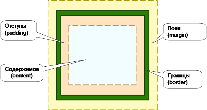 У CSS усі блочні елементи представлені як комбінація полів (margin), рамок (border), відступів (padding) та вмісту (content).
