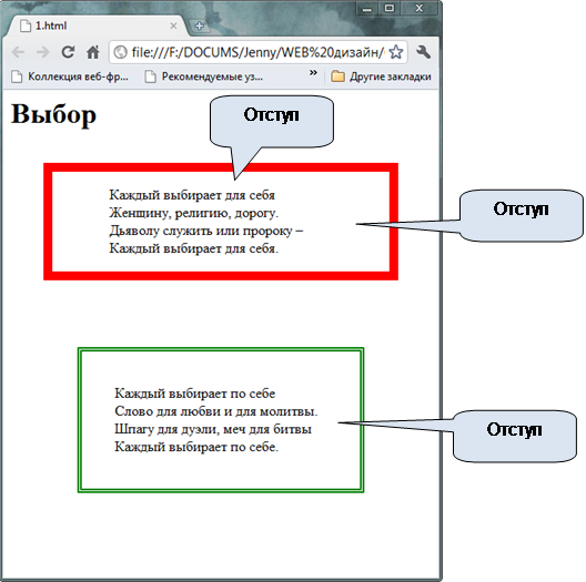 Нехай потрібно зробити навколо першого абзацу відступи по 1em зверху і знизу та по 4em справа і зліва. Навколо другого абзацу — відступи по 1см з усіх боків:
