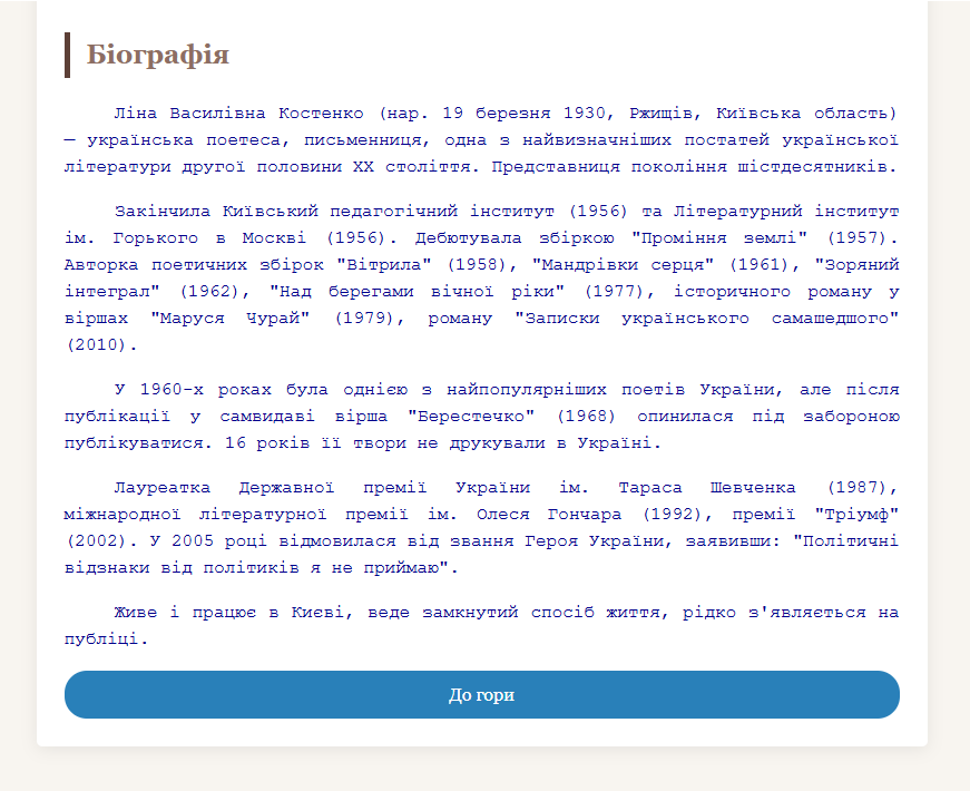 - Детальну біографію з акцентом на ключові моменти життя та творчості
