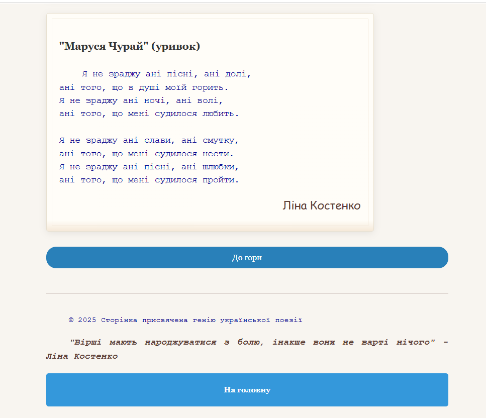 - Елегантний дизайн у теплих коричневих тонах, що підкреслює глибину її поезії
