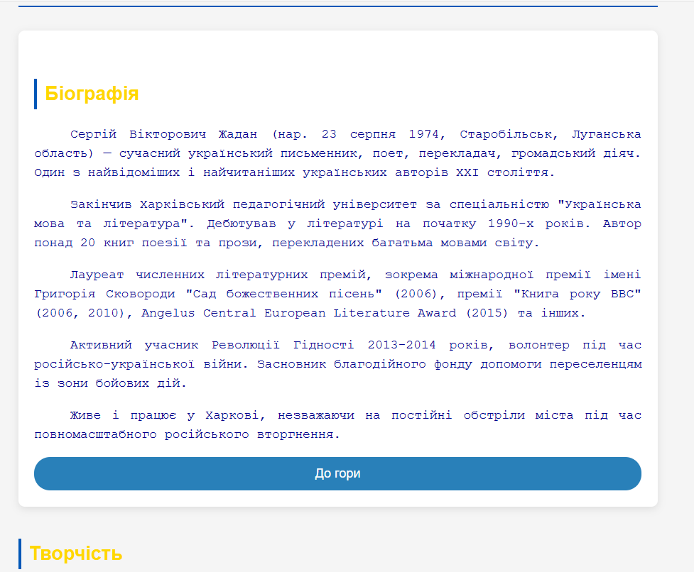 - Детальну біографію письменника з акцентом на його громадську позицію