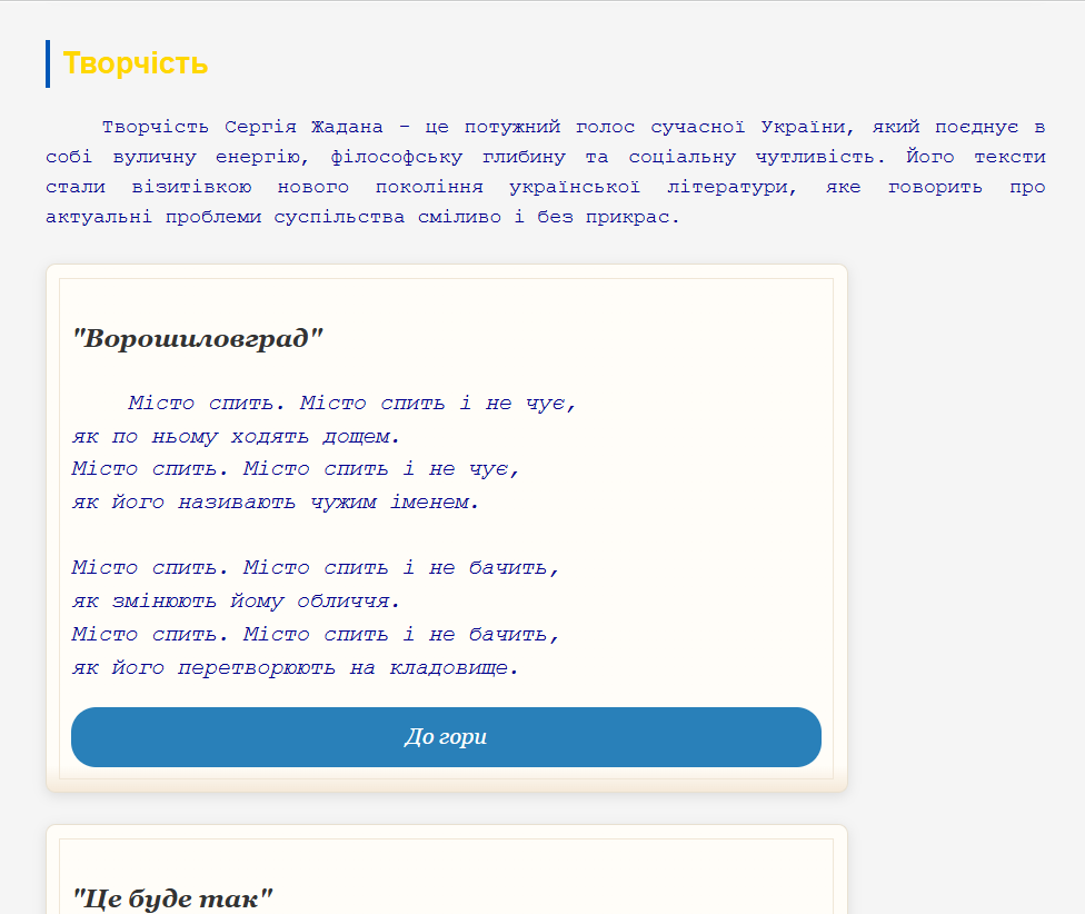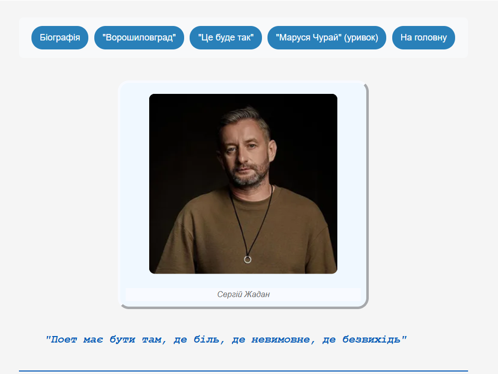 - Сторінка передає енергію та соціальну спрямованість творчості Жадана, його зв'язок із сучасними подіями в Україні.