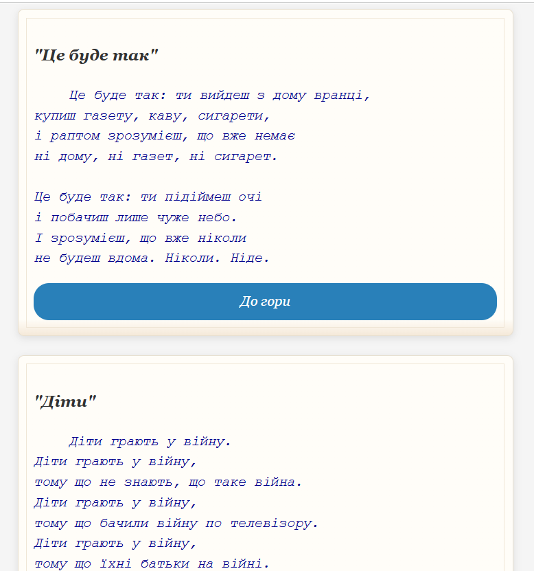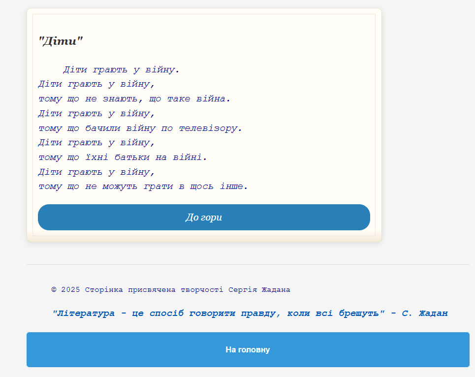 - "Діти" - соціальна поезія про вплив війни на молодше покоління;