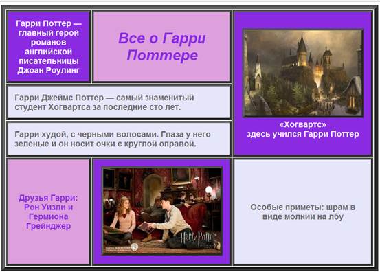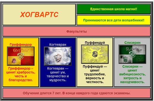 - Картинки Грифіндор.jpg, Когтевран.jpg, Пуффендуй.jpeg, Слизерин.jpg. Розміри 150px на 100px. Рамки навколо картинок такі ж, як для клітинок.