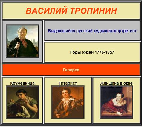 - Картинки Тропінін.jpg, Кружевниця.jpg, Гітарист.jpg, Жінка_у_вікні.jpg. Розміри 150px на 150px. Рамки навколо картинок такі ж, як для клітинок.