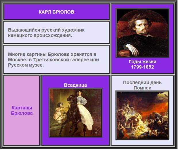 - Картинки Брюллов.jpg, Останній день Помпеї.jpg і Вершниця.jpg. Розміри 210px на 195px. Рамки навколо картинок такі ж, як для клітинок.