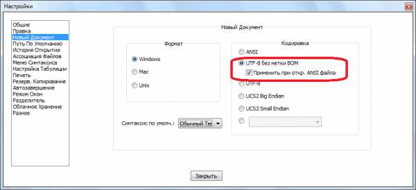 Кодування для російської мови найкраще вибрати «UTF-8 без BOM». Втім, ця настройка має стояти за замовчуванням. Якщо встановлено інше значення, змініть його. А от галочку біля запису «Застосовувати при відкритті ANSI файлу», яка встановлена в початкових налаштуваннях, краще зняти. Інакше всі відкриті документи будуть автоматично перекодовуватися, навіть якщо вам це не потрібно.