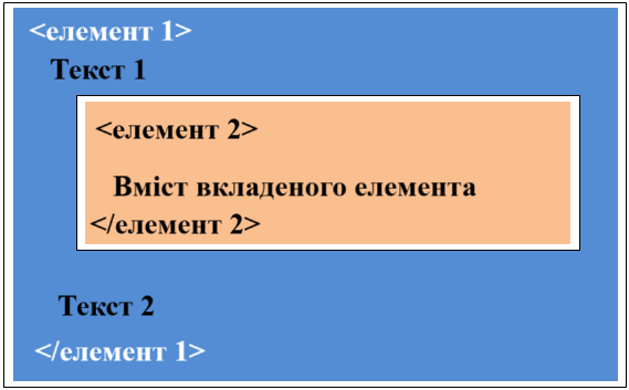 Тобто, в елемент елемент-1 вкладені два тексти і один елемент елемент-2.