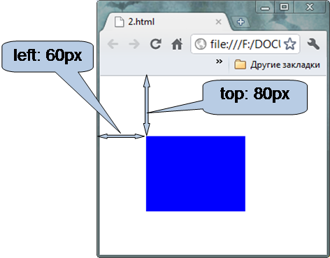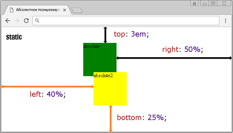 Абсолютний спосіб видаляє елемент із природного потоку позиціонування і дозволяє розмістити його на сторінці довільним чином, вказавши координати.