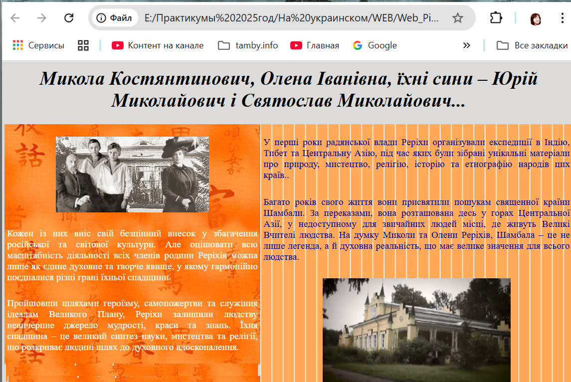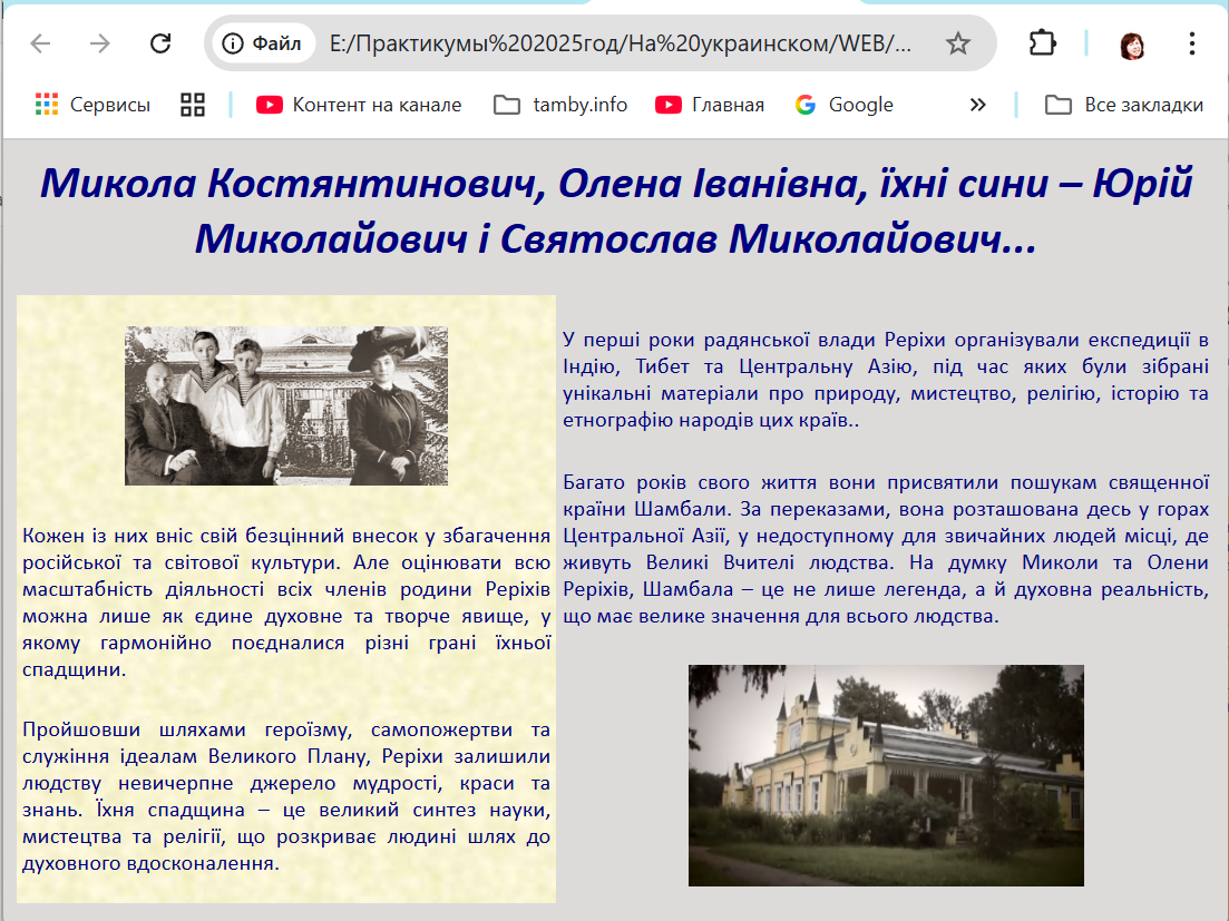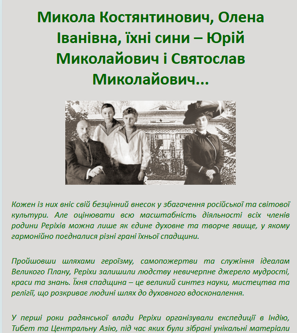 <div class="main"><h1><img src="1.png"></h1><p>Кожен із них вніс свій безцінний внесок у збагачення російської та світової культури. Але оцінювати всю масштабність діяльності всіх членів родини Реріхів можна лише як єдине духовне та творче явище, у якому гармонійно поєдналися різні грані їхньої спадщини.</p>