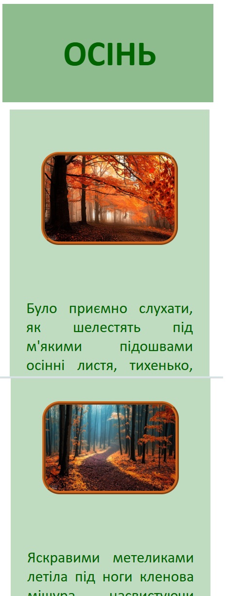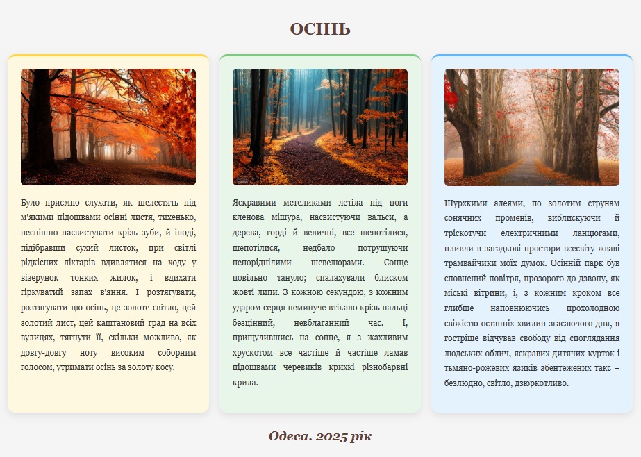 - Колір тексту у всіх блоках — darkgreen.