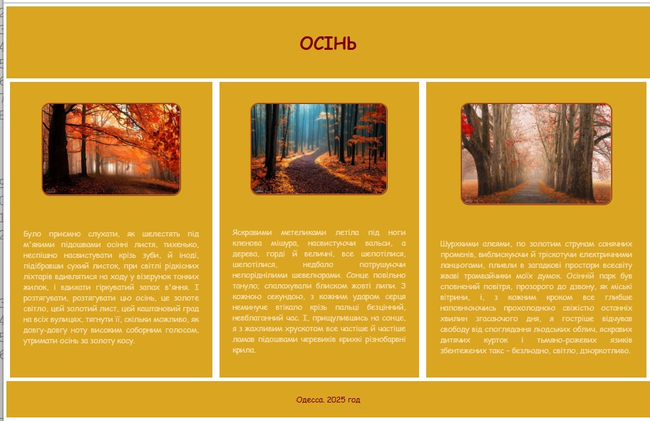 - Колір фону у всіх блоках: #DAA520.