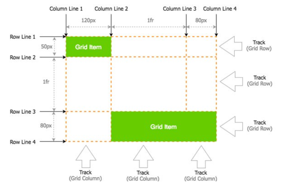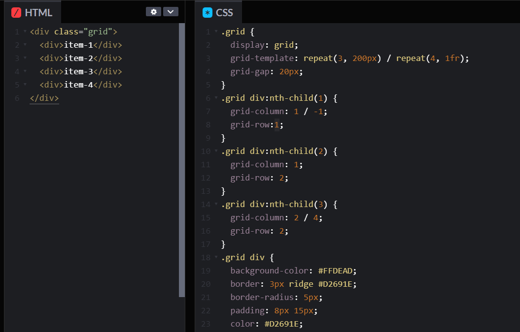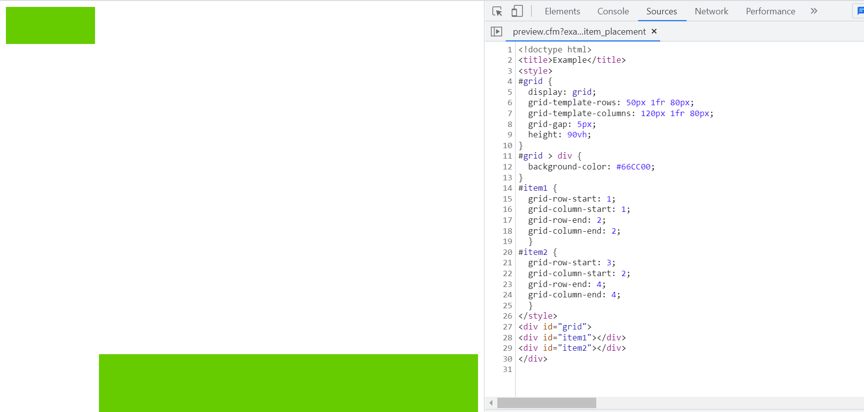 На прикладі вище, перший grid-елемент починається зі рядкової лінії 1 і колонкової лінії 1, а закінчується на рядковій лінії 2 і колонковій лінії 2. Другий grid-елемент починається на рядковій лінії 3 і колонковій лінії 2, а закінчується на рядковій лінії 4 і колонковій лінії 4.