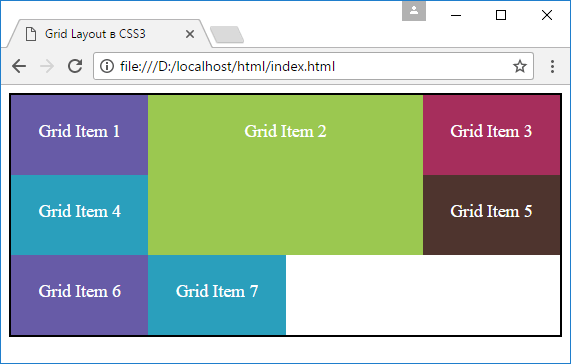 Маніпулюючи положенням елементів, ми легко можемо здійснити їх накладання, створити свого роду шари з елементів. Наприклад, визначимо наступний грід:
