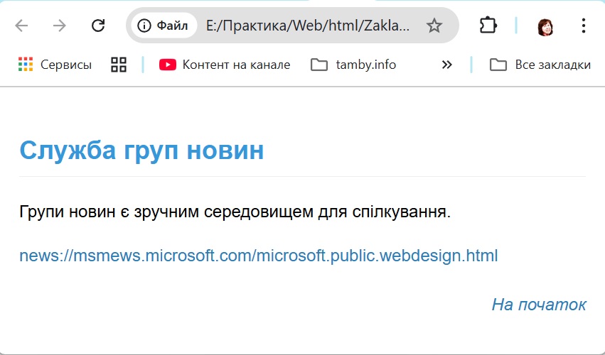 При клацанні на посиланні «На початок» відкривається файл 0.html. Відображення у блокноті: