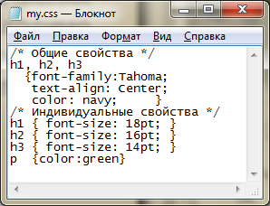 Наприклад, необхідно задати заголовкам усіх рівнів однакові властивості font-family, text-align і color, і зробити їх відмінними лише за розміром тексту: